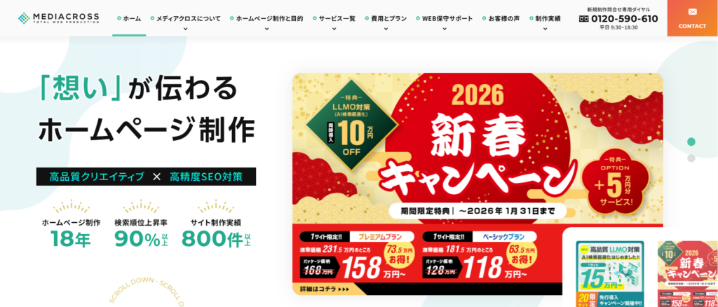 「初期費用0円」という大胆なプランを展開していますが、その本質は「長く付き合って成果を出す」という自信の表れです。SEOの実績も豊富で、特に地域密着型のビジネスと相性が良いです。
